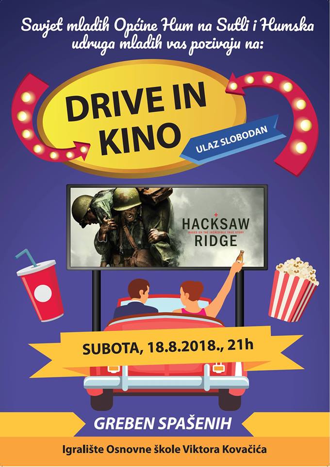 Savjet mladih Općine Hum na Sutli i Humska udruga mladih pozivaju sve zainteresirane 18.8.2018. na DriveINkino. Lokacija kina je igralište Osnovne škole Viktora Kovačića u Humu na Sutli.